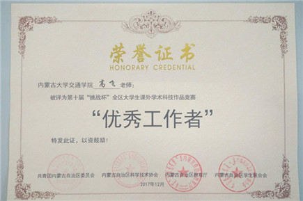 近日,第十屆“挑戰(zhàn)杯”全區(qū)大學(xué)生課外學(xué)術(shù)科技作品競(jìng)賽成績(jī)揭曉。我院上報(bào)的作品《基于交通大數(shù)據(jù)預(yù)測(cè)的路徑誘導(dǎo)系統(tǒng)的開發(fā)》(學(xué)生作者:張重慶、劉宇杰、梁瑞田,指導(dǎo)教師:李曉娟、霍月英)獲得科技發(fā)明制作A類三等獎(jiǎng);作品《呼和浩特市、包頭市道路汽車行駛工況的研究》(學(xué)生作者:趙亞瓊,指導(dǎo)教師:姚延鋼、楊曉勤)獲得自然科學(xué)類學(xué)術(shù)論文三等獎(jiǎng)。我院團(tuán)委書記高飛被第十屆“挑戰(zhàn)杯”全區(qū)大學(xué)生課外學(xué)術(shù)科技作品競(jìng)賽組委會(huì)評(píng)為優(yōu)秀工作者。